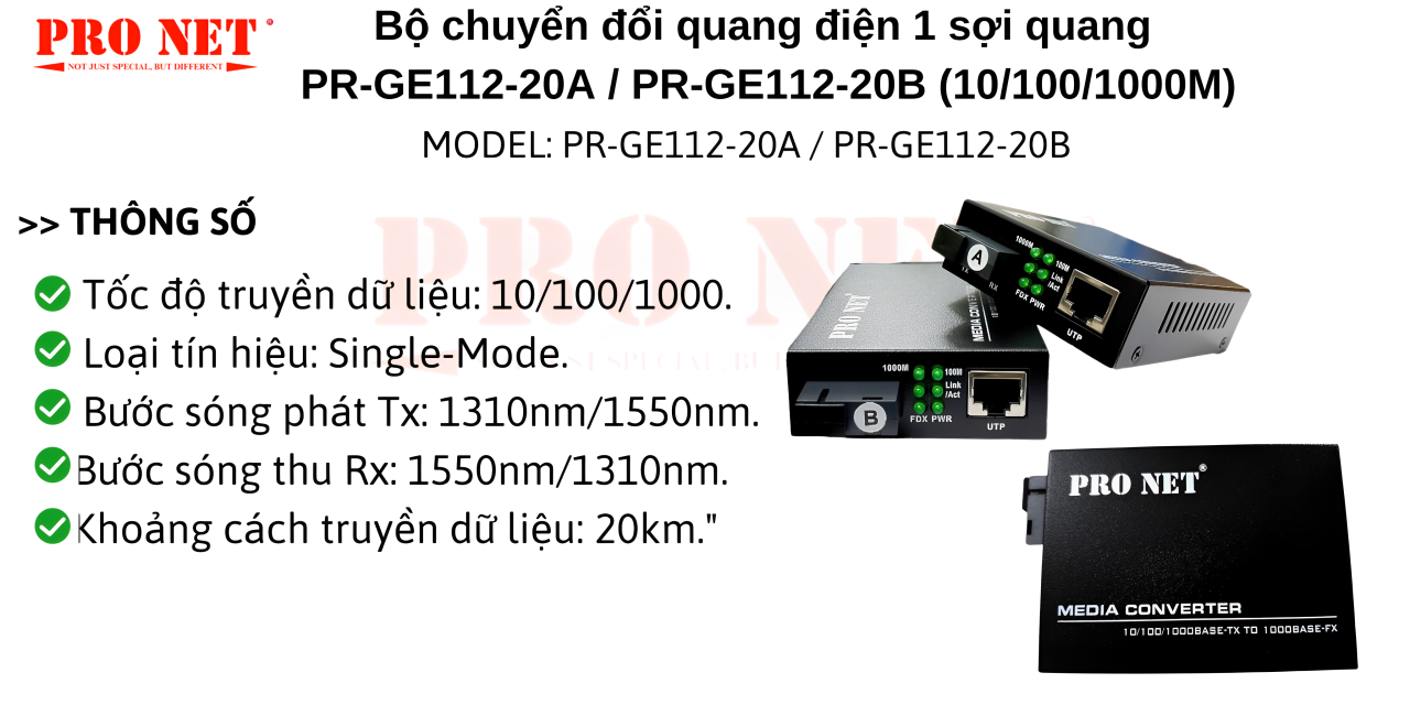 PR-GE112-20Bnổi bật với khả năng truyền tải dữ liệu ở khoảng cách xa (20km), tốc độ ổn định, và khả năng tương thích cao với các hệ thống mạng hiện có. Đặc biệt, công nghệ Single-Mode và bước sóng phát, thu chuẩn giúp đảm bảo hiệu suất cao và ổn định cho các kết nối quang trong môi trường yêu cầu tính linh hoạt và bền vững.