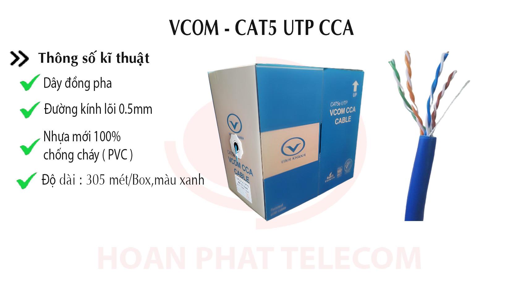 Cáp mạng VCOM CAT5 UTP CCA là loại cáp mạng chất lượng cao, phù hợp cho các ứng dụng mạng tốc độ cao và truyền tải dữ liệu ổn định. Dưới đây là một số thông tin chi tiết về sản phẩm này: