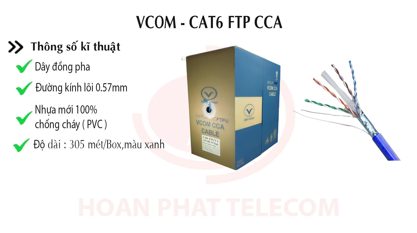 Cáp mạng VCOM CAT6 FTP CCA là loại cáp mạng chất lượng cao, phù hợp cho các ứng dụng mạng tốc độ cao và truyền tải dữ liệu ổn định. Dưới đây là một số thông tin chi tiết về sản phẩm này: